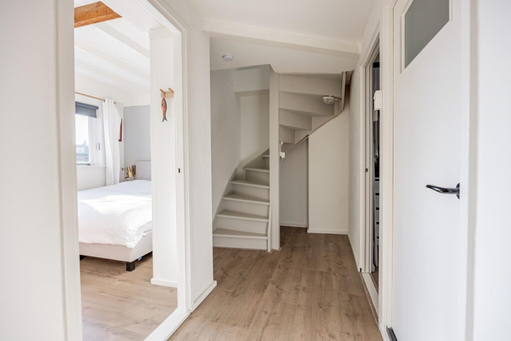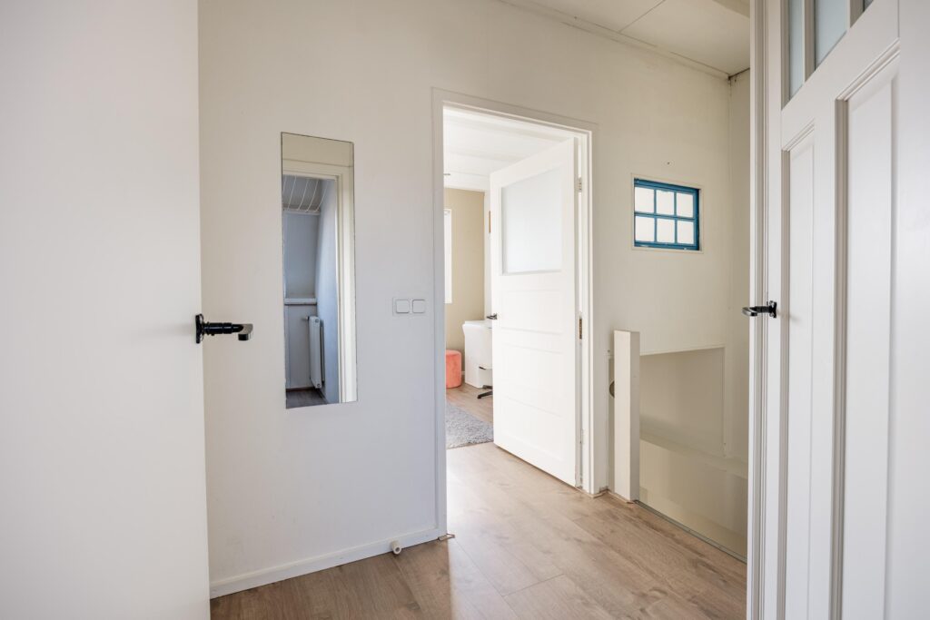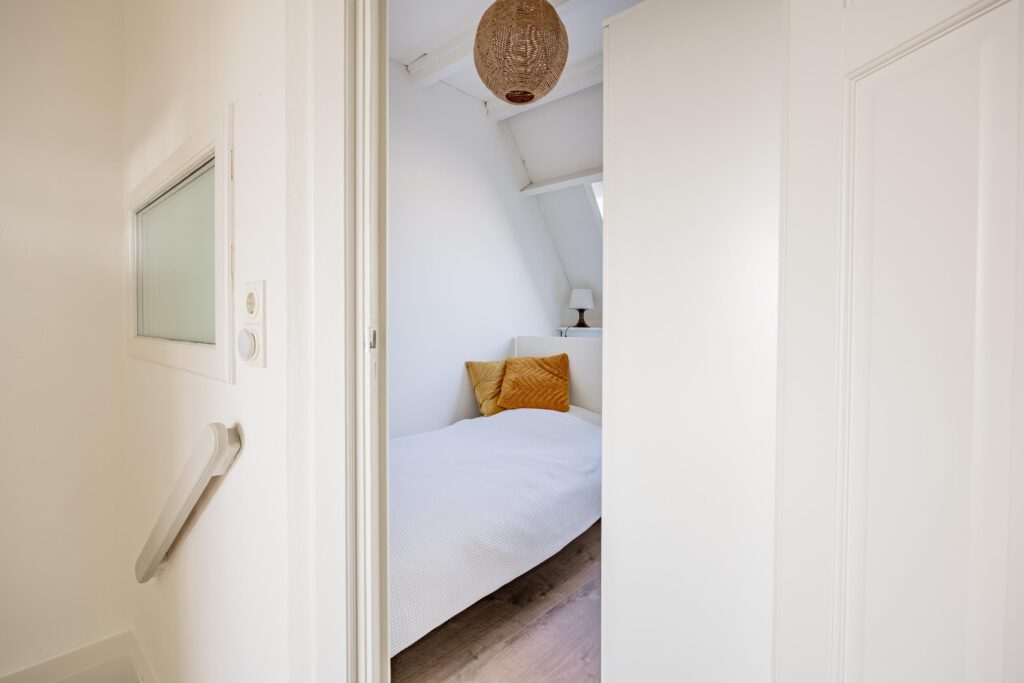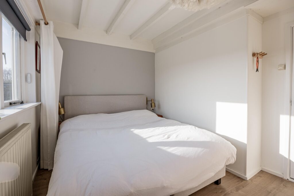 De gesloten trap vanuit de woonkamer leidt naar de eerste verdieping, waar een ruime overloop toegang biedt tot twee slaapkamers van ca. 12 en 8 m². De grootste slaapkamer ligt aan de achterzijde van de woning en geniet door de grote raampartij van veel lichtinval en een heerlijk uitzicht op de tuin. Deze kamer is bovendien voorzien van charmante inbouwkasten die zowel praktisch als stijlvol zijn. De slaapkamer aan de voorzijde is eveneens van mooi formaat en biedt volop mogelijkheden, zowel als slaap- als werkruimte. De moderne badkamer (2021) is strak en eigentijds afgewerkt en beschikt over een ligbad, separate douche, wastafel, vloerverwarming en een tweede toilet waardoor comfort en functionaliteit hier perfect samenkomen.