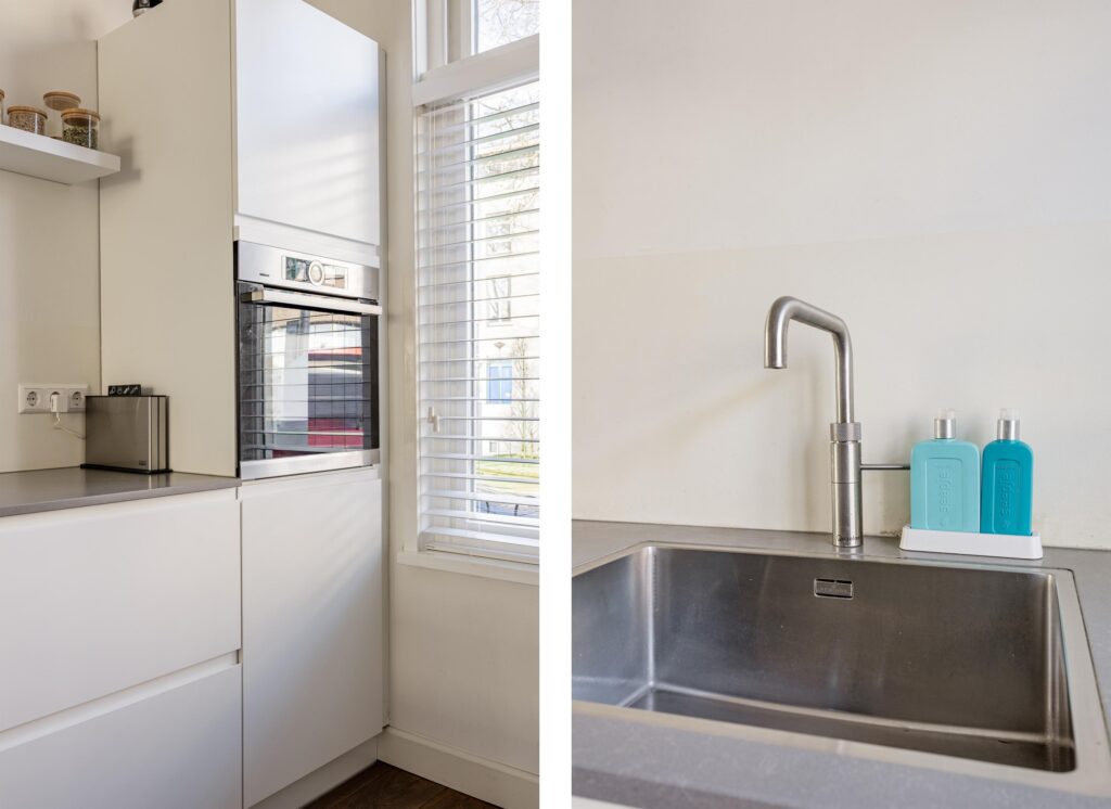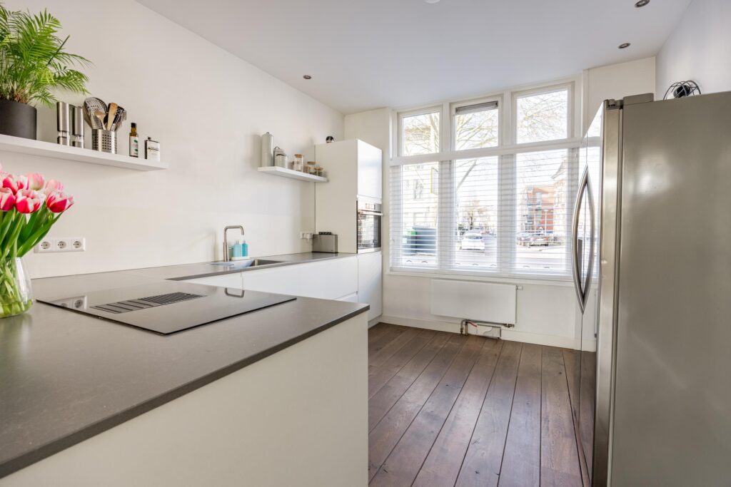 Aan de voorzijde van de woning bevindt zich de ruime, moderne keuken (2021) in een praktische opstelling met vrij uitzicht over de Bekensteinselaan. Bij het gezellige barretje van de keuken heb je een van de fijnste plekjes van het huis voor je ochtendkoffie of een glas wijn in de avond. De keuken is uitgevoerd in een tijdloze witte kleur, gecombineerd met een donkergrijs composiet werkblad en is volledig uitgerust met diverse moderne inbouwapparatuur: inductiekookplaat met afzuigsysteem, combi-oven, en vaatwasser aangevuld met een Amerikaanse losse koelkast. Alles verkeert in uitstekende staat.