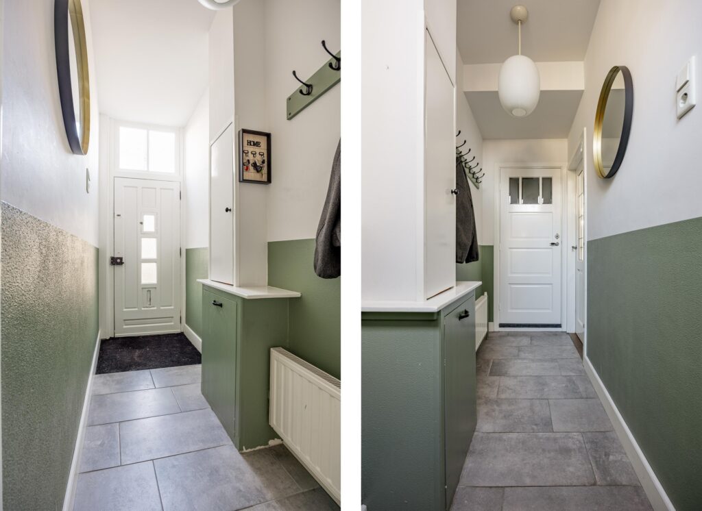 Via de klassieke voordeur met fraaie siersteentjes in de deurboog erboven, betreed je de woning. In de hal ervaar je direct de verzorgde afwerking en prettige uitstraling. De hal biedt voldoende ruimte voor een garderobe en beschikt over een modern toilet en een uitgebreide, vernieuwde meterkast. De vloer is afgewerkt met een fraaie grijze tegel en de wanden zijn strak gestukt en keurig geschilderd, wat zorgt voor een nette en tijdloze eerste indruk.